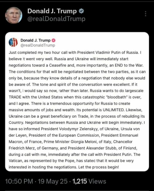 “Negotiations between Russia and Ukraine will begin immediately,” Trump said in a Truth Social post following his call with Putin, which lasted two hours.