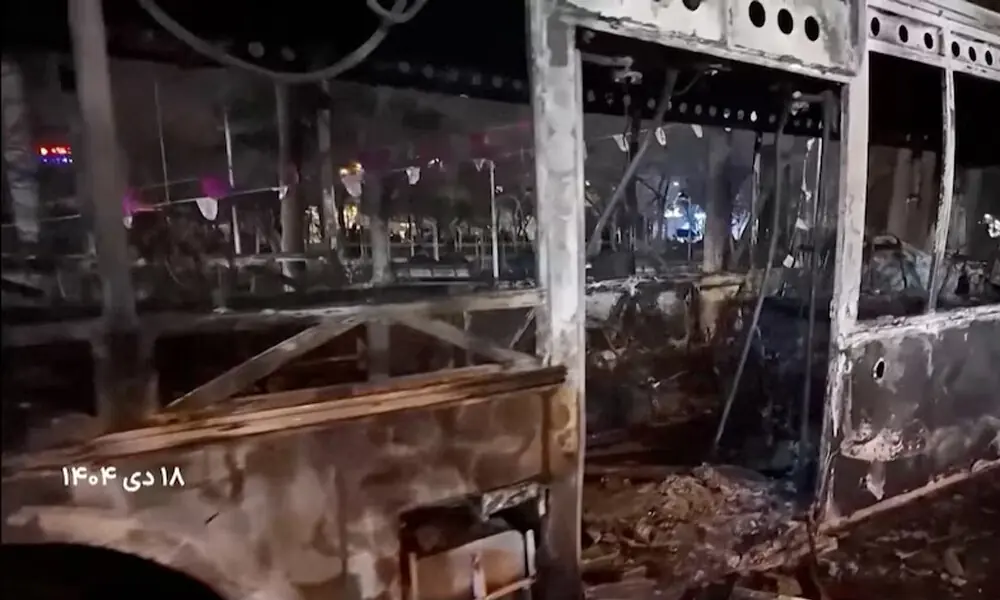A burnt car lies on the road following unrest sparked by dire economic conditions, in a place given as Tehran. Photo: Reuters