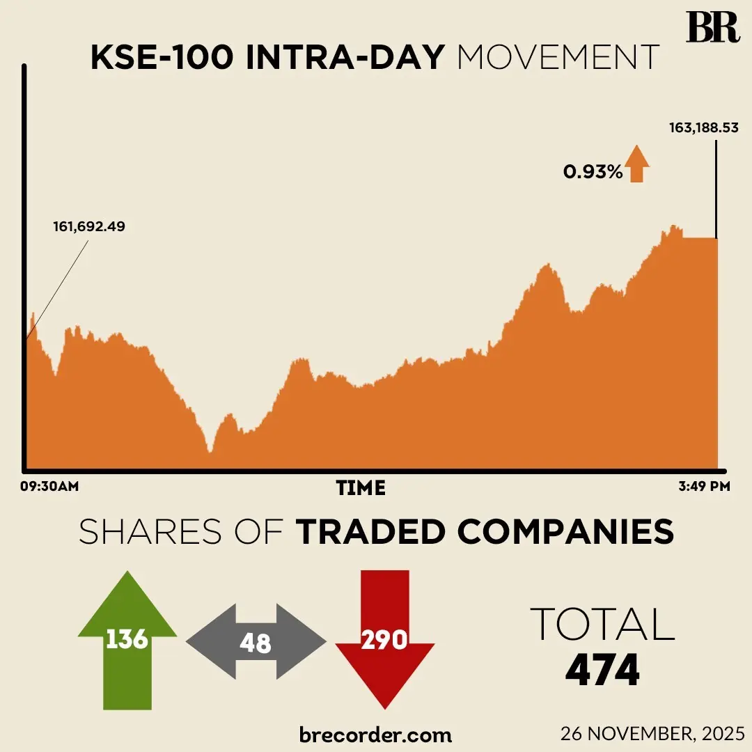 At close, the benchmark index settled at 163,188.53, an increase of 1,496.04 points or 0.93%.