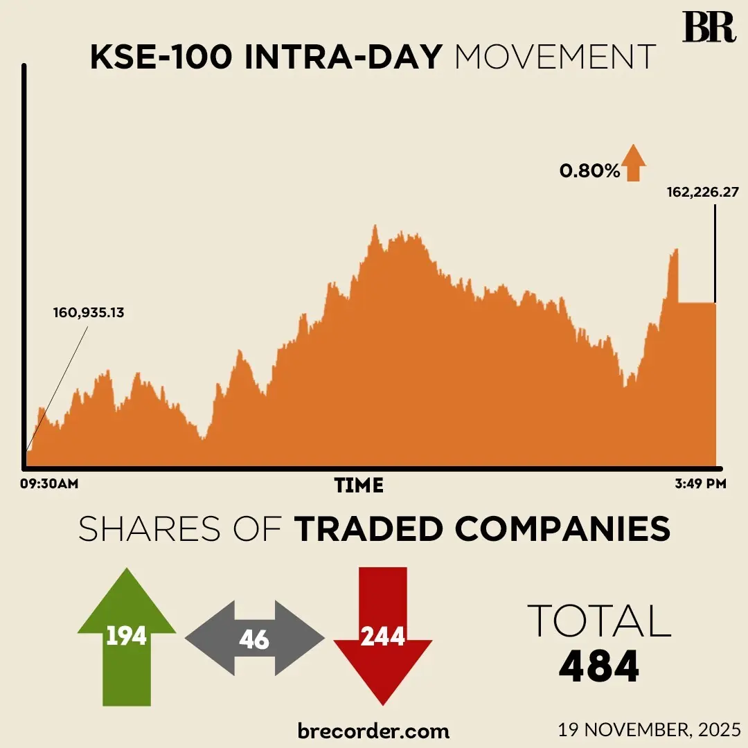 At close, the KSE-100 Index settled at 162,226.27, a gain of 1,291.14 points or 0.80%.