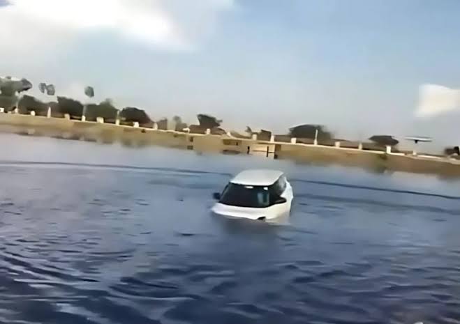 A car found itself stuck in the sea at Karachi’s Seaview after the driver made a bold and risky attempt to drive directly into the water. The incident caused quite a stir as onlookers gathered, watching the waves surround the vehicle.