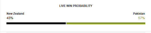 Pakistan’s efforts to stop the squeeze the Kiwis’ was ruined by an inside edge boundary in Abrar’s fourth over after four dot balls. A single to end the over bring five from it with New Zealand score at 55 for the loss of 2 wickets after 12 overs.