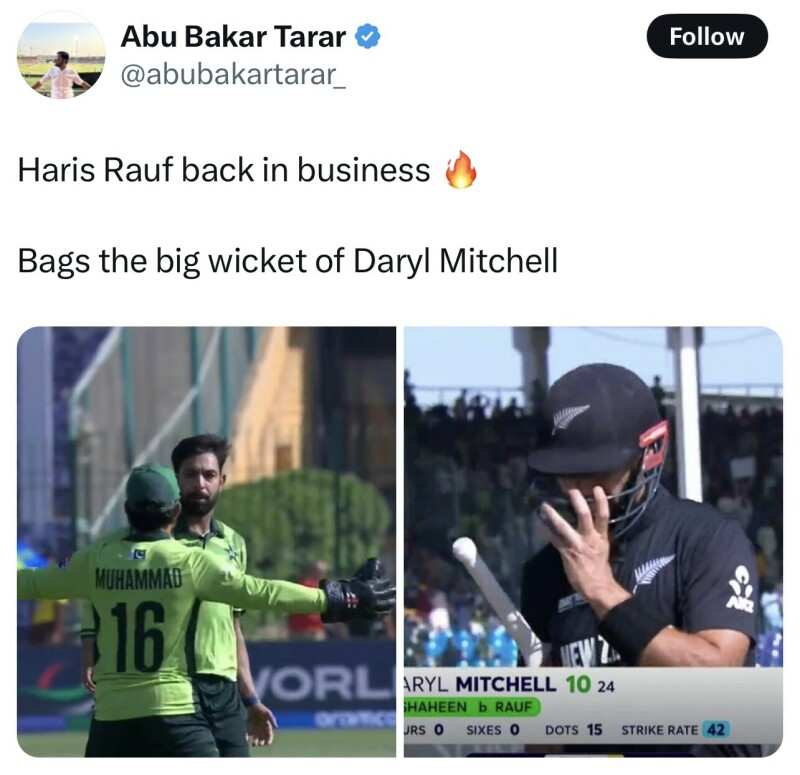 Mitchell was the next to depart for New Zealand after he was dismissed by Haris, caught by Shaheen Afridi at mid-on. A major breakthrough Pakistan as the dangerous Mitchell departs with the Kiwi score at 73 for the loss of three wickets.