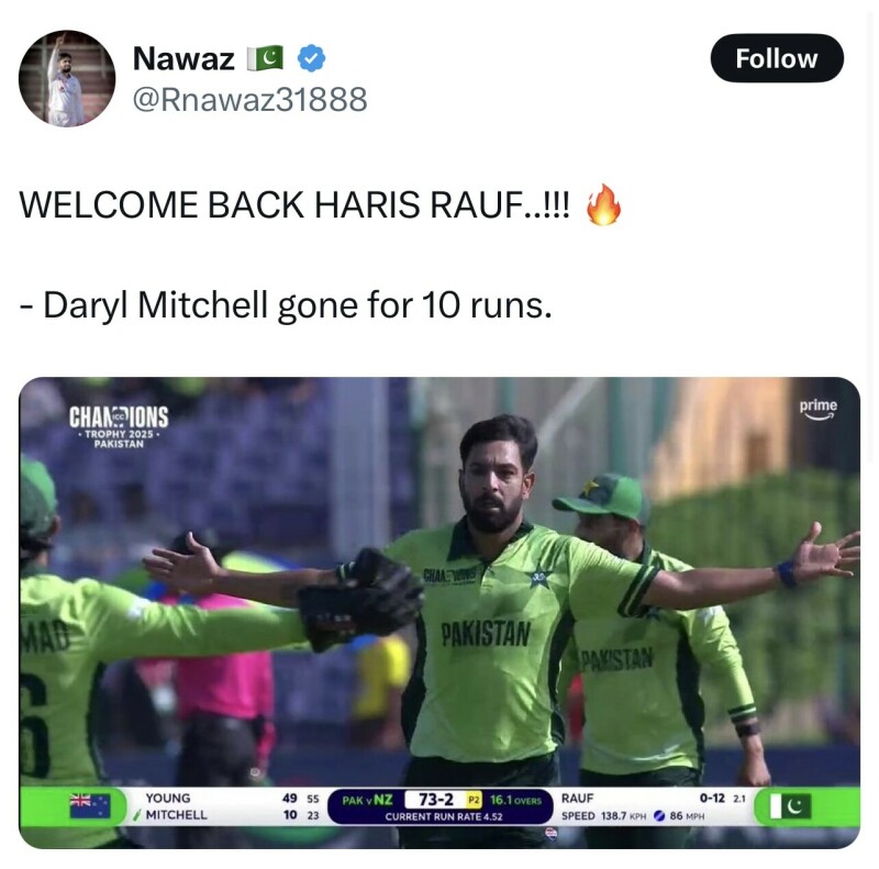 The turning point came through Abrar Ahmed’s crafty carrom ball that deceived Convay, followed by Naseem Shah’s perfect delivery to dismiss Kane Williamson for a rare single-digit score — his first since January 2019. The pressure mounted as Haris Rauf, returning from his side strain, removed the usually reliable Daryl Mitchell for 10 off 24 balls. Young continues to hold the fort, having registered his third ODI 50 in Pakistan, but with the middle order being tested against a full-strength Pakistani bowling lineup featuring the returning Rauf, the visitors face an uphill task in setting a competitive total.
