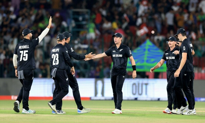 Pakistan’s nemesis Daryl Mitchell came out to bat. Unfazed by a delivery missing his outside edge, the Kiwi batter dispatched an in-swinging delivery at the stumps for a boundary on midwicket. The Kiwi score stood at 45 for the loss of two wickets nine overs.