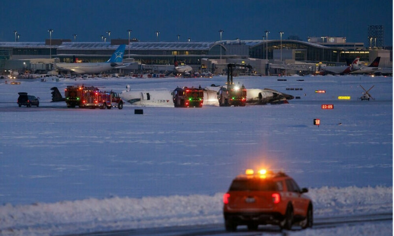 TORONTO: A Delta Air Lines regional jet flipped upside down upon landing at Canada’s Toronto Pearson Airport on Monday amid windy weather following a snowstorm, injuring 18 of the 80 people on board, officials said.