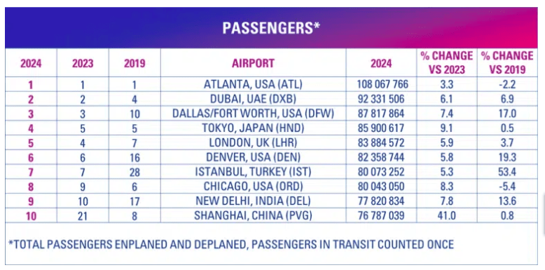 Among global traffic rankings, Hartsfield-Jackson Atlanta International Airport defended its top position, followed by Dubai International Airport and Dallas Fort Worth International Airport.