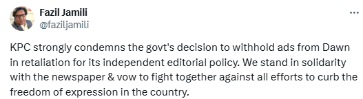 Similarly, Karachi Press Club President Fazil Jamili said in a statement that the organisation “strongly condemns the government’s decision to withhold advertisements from media newspaper in retaliation for its independent editorial policy”.