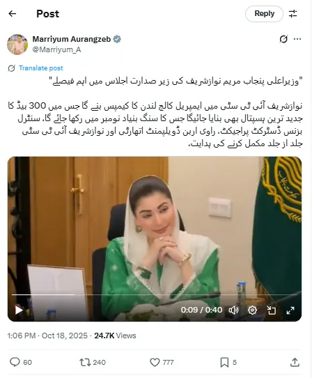 On October 18, the PML-N had posted on its official X account about a meeting chaired by Punjab Chief Minister Maryam Nawaz. The post said that a campus of Imperial College London would open at the Nawaz Sharif IT City, adding that the foundation stone would be laid in November.