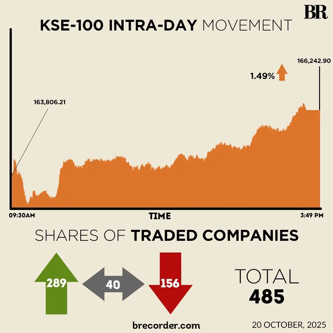 Driven by renewed investor confidence, the KSE-100 Index hit an intra-day high of 166,421.33.