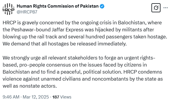The Human Rights Commission of Pakistan (HRCP) expressed “grave concern” on the attack in a statement today and demanded that all hostages be released immediately.
