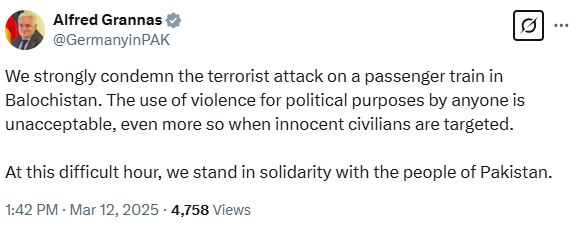 “We strongly condemn the attack on the Jaffar Express train, and the hostage-taking of passengers in Kacchi, Balochistan, claimed by the Baloch Liberation Army, a US-Specially Designated Global Terrorist group,” the US Embassy in Islamabad posted on X.