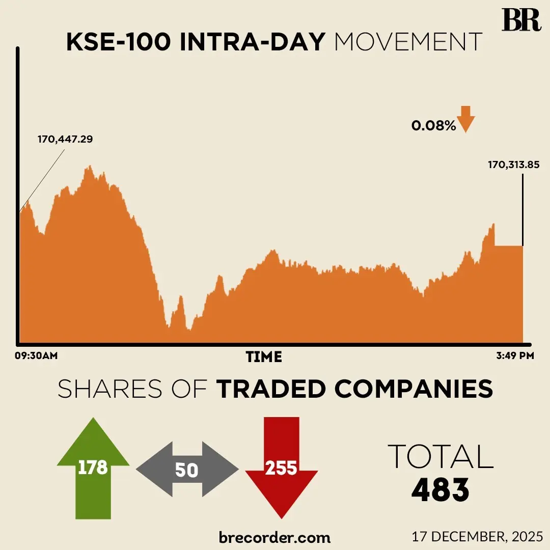 Pakistan’s equity market ended yesterday’s session in negative territory as broad-based selling outweighed early optimism, leaving investors cautious despite improved liquidity and heightened participation across key sectors. The KSE-100 Index slipped 294.05 points, or 0.17%, to close at 170,447.30 points.