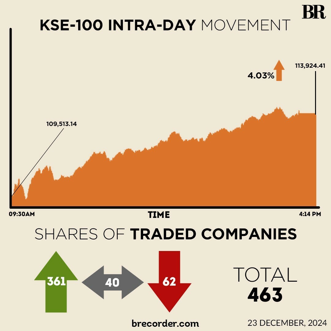 At close, the benchmark index settled at 113,924.41, an increase of 4,411.27 points or 4.03%.