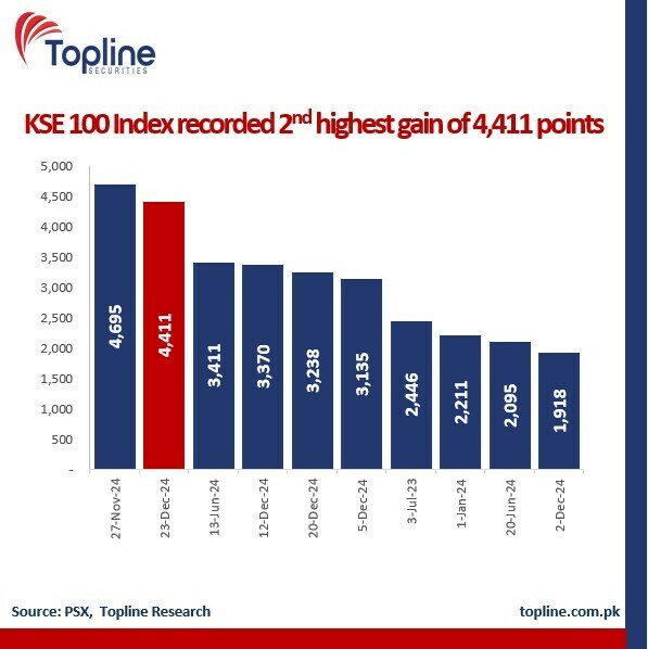 It was the second largest single-day gain for KSE-100 in terms of points, brokerage house Topline Securities said.