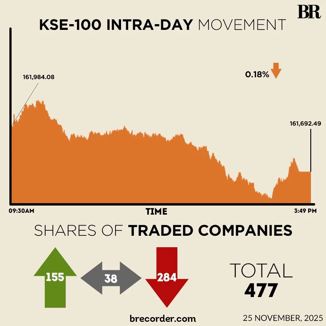 The KSE-100 ended at 161,984.09 points, down 118.84 points or 0.07%.