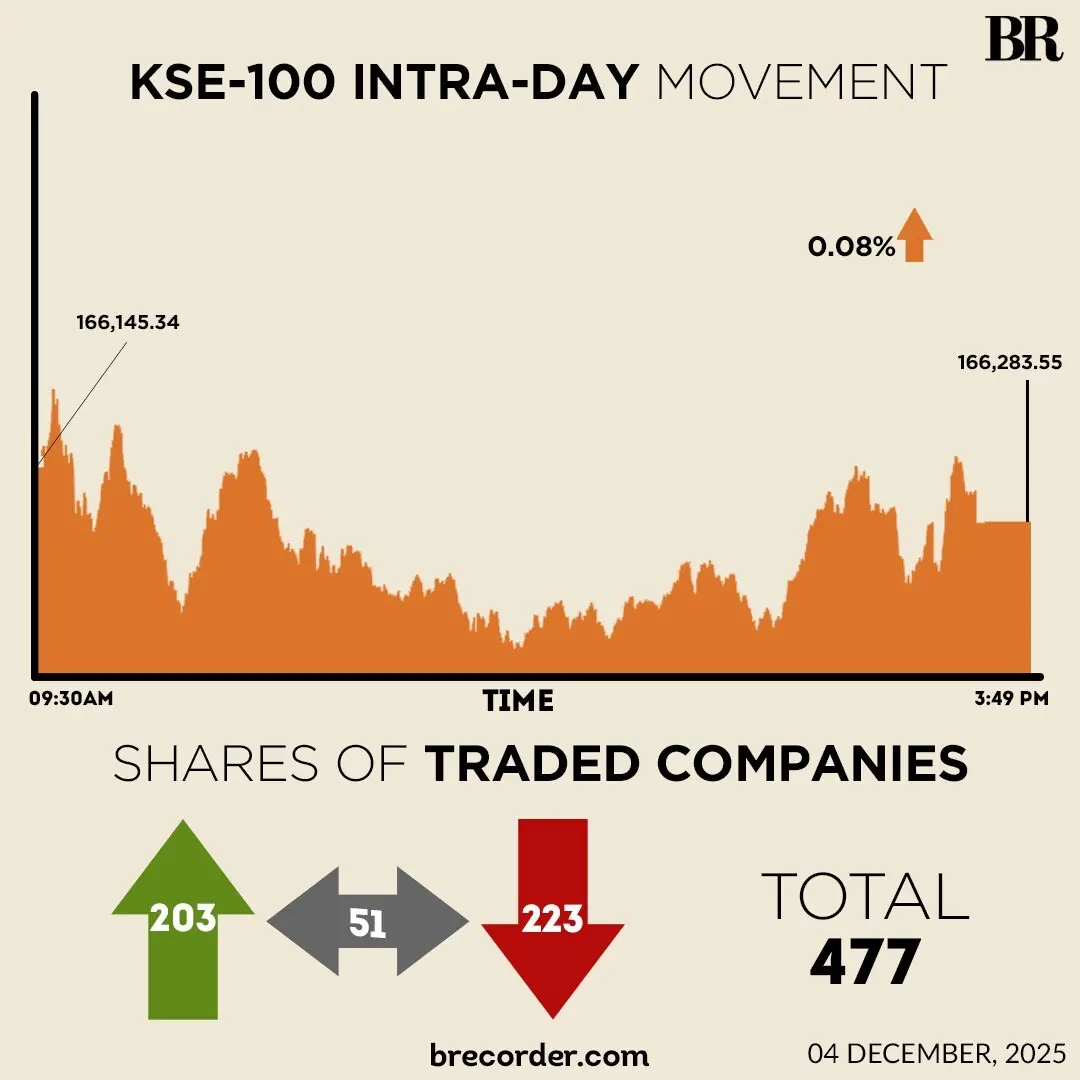 At close, the KSE-100 Index settled at 166,283.55, marginally up by 138.20 points or 0.08%.