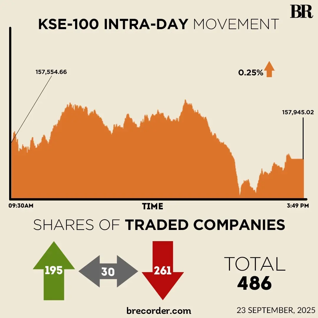 At close, the benchmark index settled at 157,945.03, up by 390.36 points or 0.25%.
