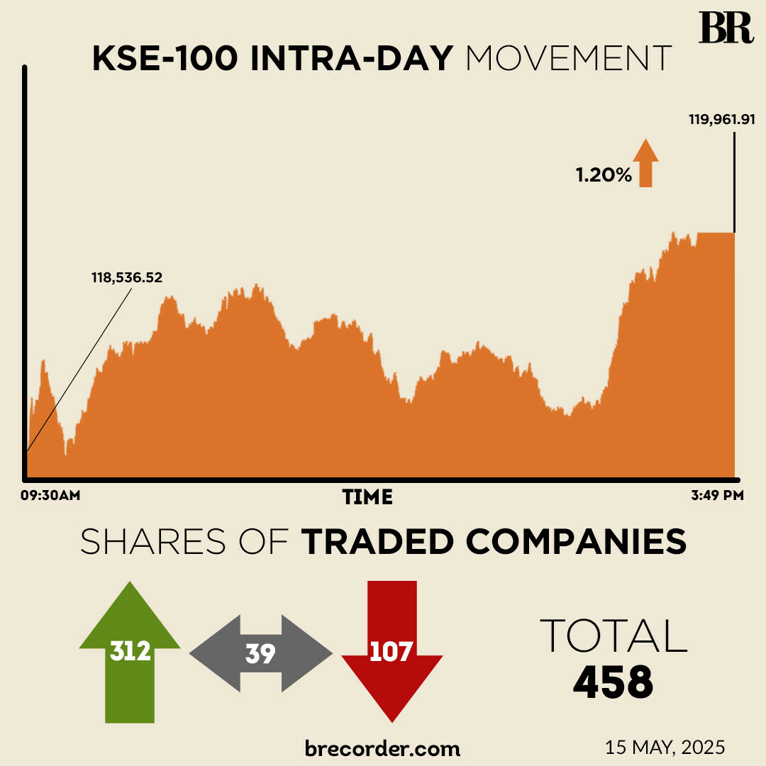 The KSE-100 witnessed a positive momentum throughout the session, hitting an intra-day high of 119,990.30.