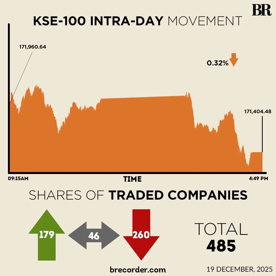 At close, the KSE-100 settled at 171,404.48, a decrease of 556.16 points or 0.32%