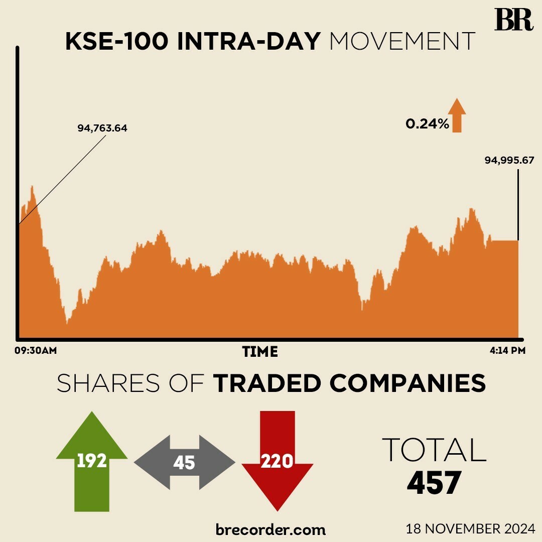 At close, the benchmark index settled at 94,995.67, up by 232.03 points 0.24%.