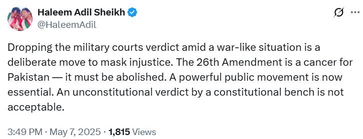 PTI Sindh President Haleem Adil Sheikh mentioned the timing of the verdict, saying, “Dropping the military courts verdict amid a war-like situation is a deliberate move to mask injustice.”