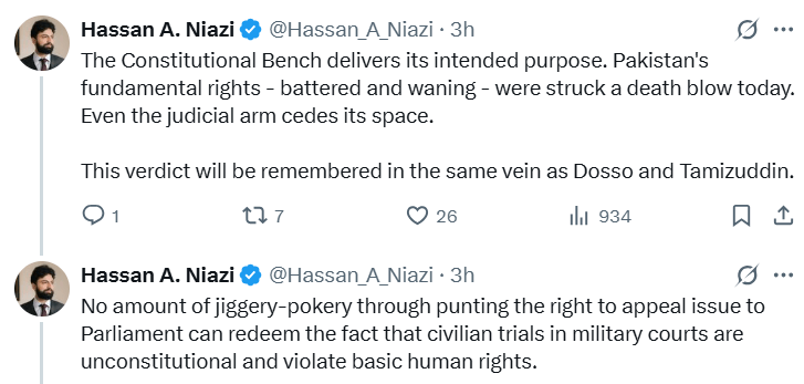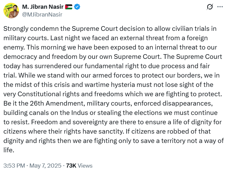 Lawyer Reema Omer termed the order “terrible”. “A pity the highest court of the land is on board with such militarisation of justice in the country,” she said on X.