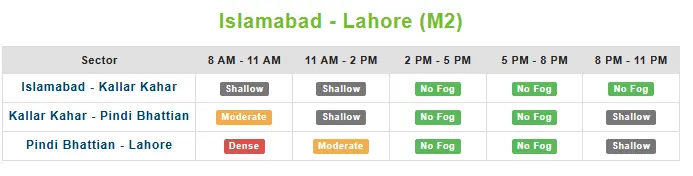 According to the Pakistan Meteorological Department’s fog forecast, the M-2 (Pindi Bhattian-Lahore), M-3 (Lahore – Abdul Hakim), M-11 (Sialkot – Lahore), M-4 (Pindi Bhattian – Faisalabad), and M-5 (Multan – Sukkur) were expected to remain in “dense“ fog situation till 11am.