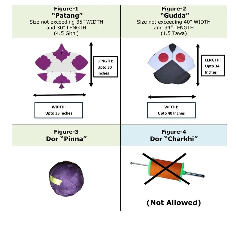 Specifications for permitted kites were also shared. A ‘patang’ shall not exceed 35 inches in width and 30 inches in length, while a ‘gudda’ cannot exceed 40 inches in width and 34 inches in length.