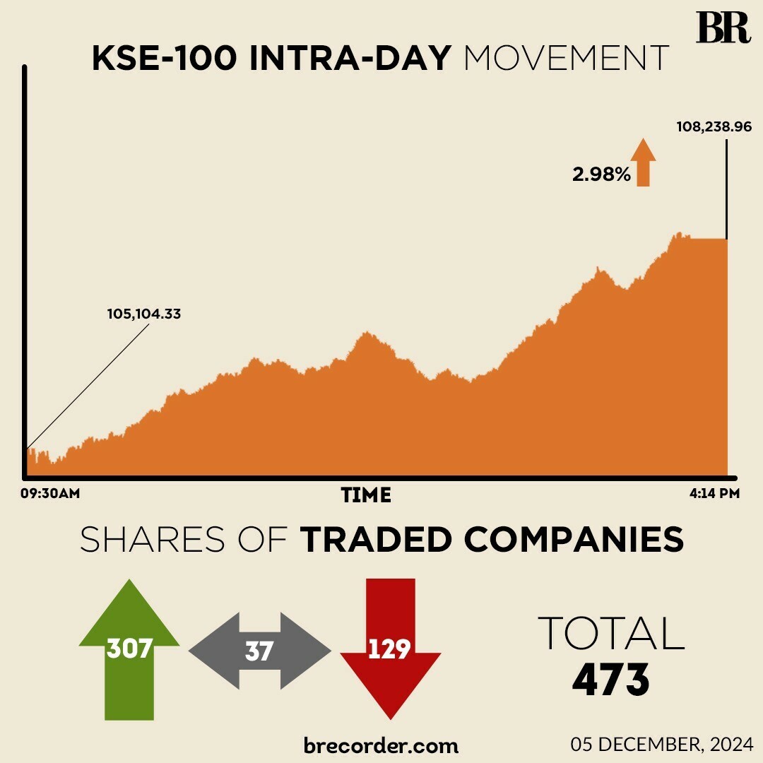 There was no stopping the KSE-100 on Thursday as a wider market buying spree propelled the benchmark index to settle above 108,000, a new record high, with a gain of over 3,000 points.