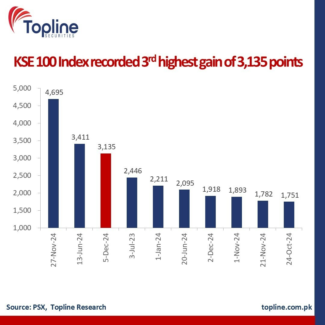 Topline Securities shared that this was the third-highest increase posted by the KSE-100 in terms of points.