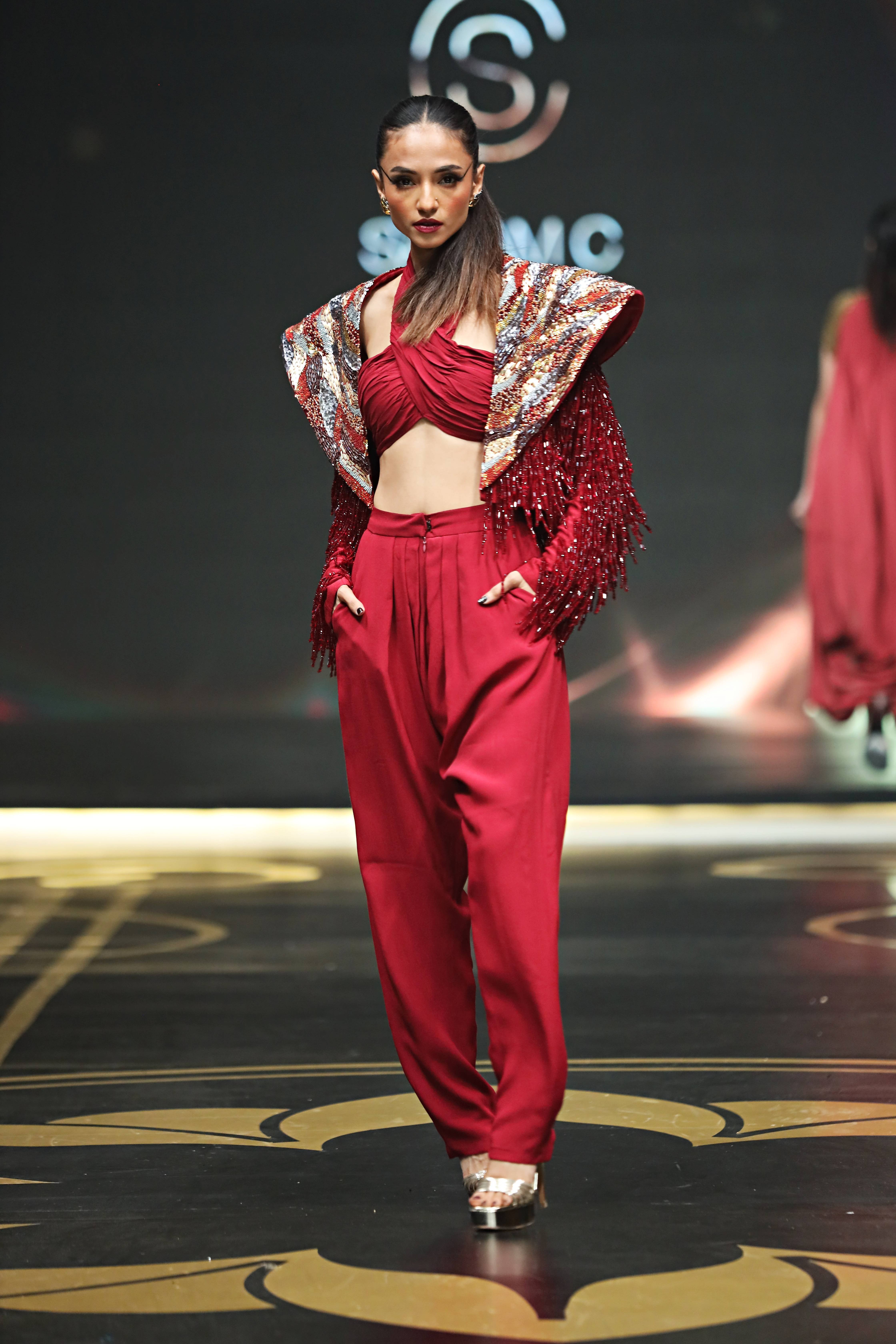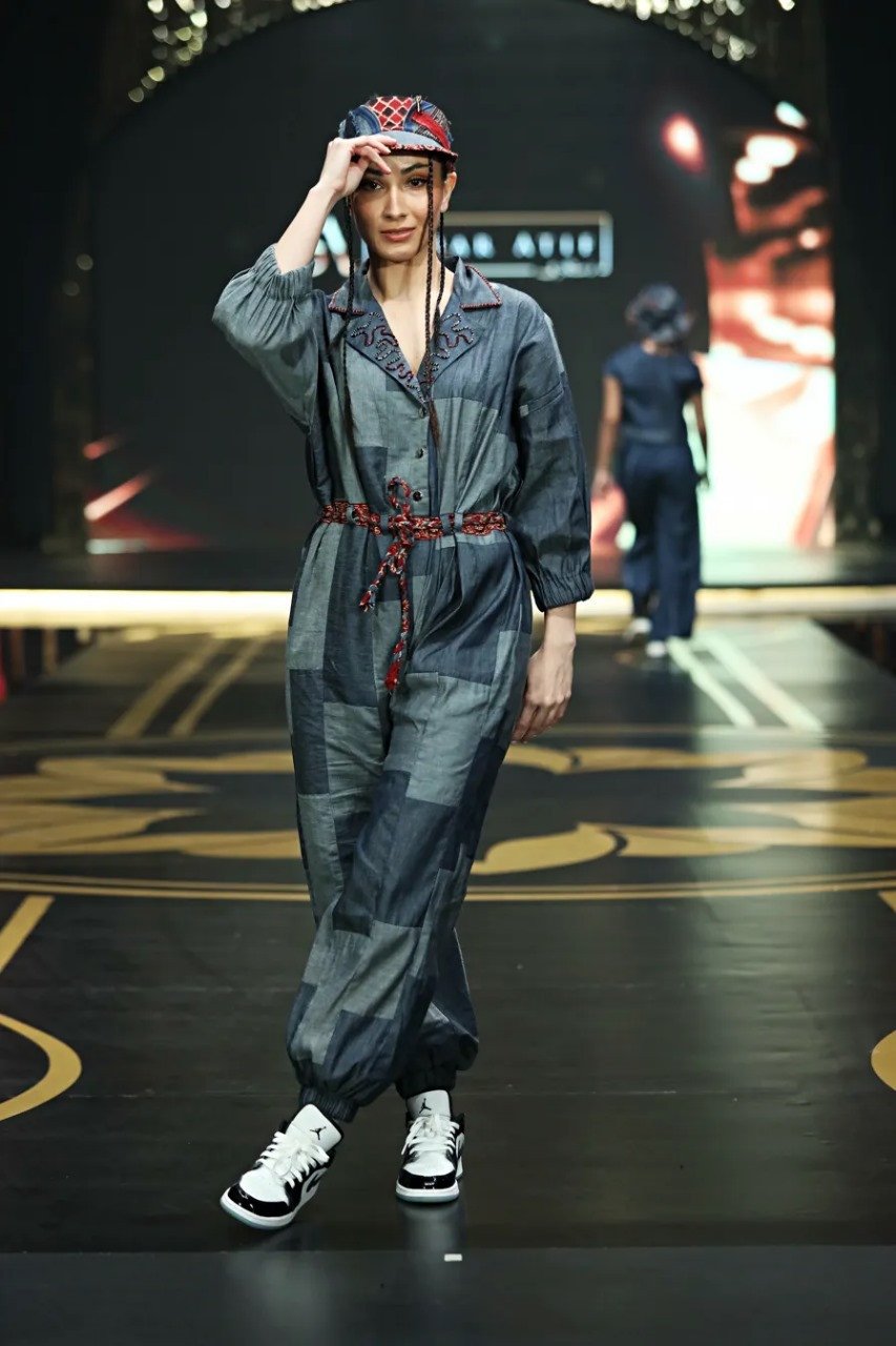 Sahar Atif’s Salvaged Selvedge stood out for its inventive mix of street style and cultural heritage, making it the most compelling showcase of the evening. Breathing new life into discarded denim, Atif artfully married the rugged appeal of upcycled denim with the sophisticated heritage of Sindhi Ajrak patterns. Models walked the runway in deconstructed vests with industrial mesh pockets, trimmed with Ajrak borders, paired with wide-leg trousers featuring intricate patchwork. On more than one occasion, a jacket’s exaggerated proportions were balanced by a black tank underneath, while gathered harem-style pants completed the silhouette with studied nonchalance. A colour-blocked jumpsuit in varying shades of indigo, cinched at the waist with an Ajrak-printed belt was among Atif’s most successful looks. Each outfit told a distinct story, from relaxed-fit jackets with traditional trims to distressed patchwork pants that added an urban edge. White sneakers anchored the look, while bohemian braids woven with Ajrak threads framed the models’ faces, rounding out the street-savvy, heritage-infused aesthetic.