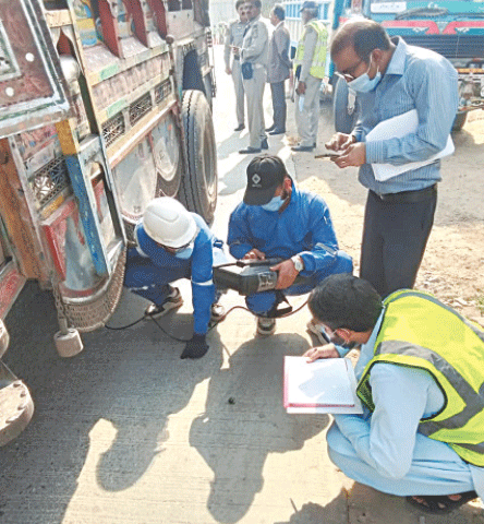 Pak-EPA enforcement team inspects a vehicle for smoke emission under the ongoing vehicular emission testing drive in Islamabad on Sunday. — White Star