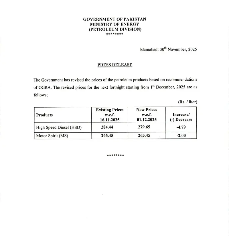 The federal government has revised the prices of petroleum products for the next fortnight, effective from December 1, based on the recommendation of the Oil and Gas Regulatory Authority (OGRA), read the notification.