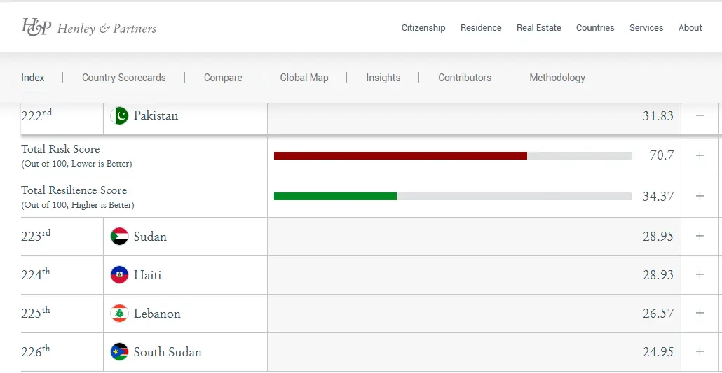 Pakistan is ranked among the least resilient nations in the Global Investment Risk and Resilience Index by Henley & Partners, highlighting persistent challenges in economic stability, governance, and investor confidence.