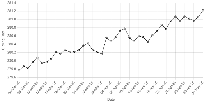 “25-Mar-25”, “26-Mar-25”, “27-Mar-25”, “28-Mar-25”, “03-Apr-25”, “04-Apr-25”, “07-Apr-25”, “08-Apr-25”, “09-Apr-25”, “10-Apr-25”, “11-Apr-25”, “14-Apr-25”, “15-Apr-25”, “16-Apr-25”, “17-Apr-25”, “18-Apr-25”, “21-Apr-25”, “22-Apr-25”, “23-Apr-25”, “24-Apr-25”, “25-Apr-25”, “28-Apr-25”, “29-Apr-25”, “30-Apr-25”, “02-May-25”, “05-May-25”