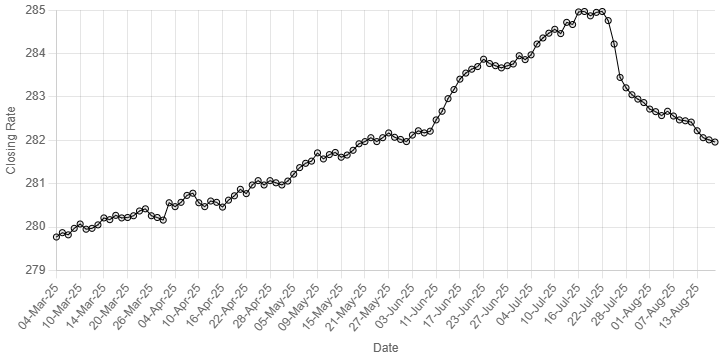 “25-Mar-25”, “26-Mar-25”, “27-Mar-25”, “28-Mar-25”, “03-Apr-25”, “04-Apr-25”, “07-Apr-25”, “08-Apr-25”, “09-Apr-25”, “10-Apr-25”, “11-Apr-25”, “14-Apr-25”, “15-Apr-25”, “16-Apr-25”, “17-Apr-25”, “18-Apr-25”, “21-Apr-25”, “22-Apr-25”, “23-Apr-25”, “24-Apr-25”, “25-Apr-25”, “28-Apr-25”, “29-Apr-25”, “30-Apr-25”, “02-May-25”, “05-May-25”, “06-May-25”, “07-May-25”, “08-May-25”, “09-May-25”, “12-May-25”, “13-May-25”, “14-May-25”, “15-May-25”, “16-May-25”, “19-May-25”, “20-May-25”, “21-May-25”, “22-May-25”, “23-May-25”, “26-May-25”, “27-May-25”, “29-May-25”, “30-May-25”, “02-Jun-25”, “03-Jun-25”, “04-Jun-25”, “05-Jun-25”, “10-Jun-25”, “11-Jun-25”, “12-Jun-25”, “13-Jun-25”, “16-Jun-25”, “17-Jun-25”, “18-Jun-25”, “19-Jun-25”, “20-Jun-25”, “23-Jun-25”, “24-Jun-25”, “25-Jun-25”, “26-Jun-25”, “27-Jun-25”, “30-Jun-25”, “02-Jul-25”, “03-Jul-25”, “04-Jul-25”, “07-Jul-25”, “08-Jul-25”, “09-Jul-25”, “10-Jul-25”, “11-Jul-25”, “14-Jul-25”, “15-Jul-25”, “16-Jul-25”, “17-Jul-25”, “18-Jul-25”, “21-Jul-25”, “22-Jul-25”, “23-Jul-25”, “24-Jul-25”, “25-Jul-25”, “28-Jul-25”, “29-Jul-25”, “30-Jul-25”, “31-Jul-25”, “01-Aug-25”, “04-Aug-25”, “05-Aug-25”, “06-Aug-25”, “07-Aug-25”, “08-Aug-25”, “11-Aug-25”, “12-Aug-25”, “13-Aug-25”, “15-Aug-25”, “18-Aug-25”, “19-Aug-25”