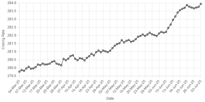 At close, the currency settled at 283.95, a loss of Re0.19 against the previous close.