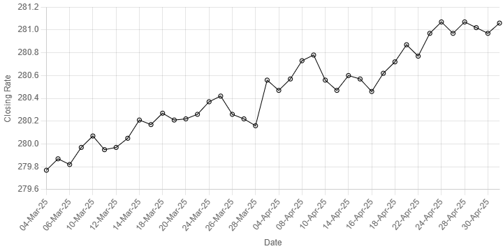 “25-Mar-25”, “26-Mar-25”, “27-Mar-25”, “28-Mar-25”, “03-Apr-25”, “04-Apr-25”, “07-Apr-25”, “08-Apr-25”, “09-Apr-25”, “10-Apr-25”, “11-Apr-25”, “14-Apr-25”, “15-Apr-25”, “16-Apr-25”, “17-Apr-25”, “18-Apr-25”, “21-Apr-25”, “22-Apr-25”, “23-Apr-25”, “24-Apr-25”, “25-Apr-25”, “28-Apr-25”, “29-Apr-25”, “30-Apr-25”, “02-May-25”