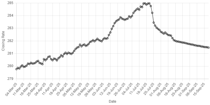 On Wednesday, the local unit closed at 281.50.