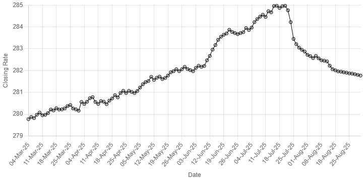 “25-Mar-25”, “26-Mar-25”, “27-Mar-25”, “28-Mar-25”, “03-Apr-25”, “04-Apr-25”, “07-Apr-25”, “08-Apr-25”, “09-Apr-25”, “10-Apr-25”, “11-Apr-25”, “14-Apr-25”, “15-Apr-25”, “16-Apr-25”, “17-Apr-25”, “18-Apr-25”, “21-Apr-25”, “22-Apr-25”, “23-Apr-25”, “24-Apr-25”, “25-Apr-25”, “28-Apr-25”, “29-Apr-25”, “30-Apr-25”, “02-May-25”, “05-May-25”, “06-May-25”, “07-May-25”, “08-May-25”, “09-May-25”, “12-May-25”, “13-May-25”, “14-May-25”, “15-May-25”, “16-May-25”, “19-May-25”, “20-May-25”, “21-May-25”, “22-May-25”, “23-May-25”, “26-May-25”, “27-May-25”, “29-May-25”, “30-May-25”, “02-Jun-25”, “03-Jun-25”, “04-Jun-25”, “05-Jun-25”, “10-Jun-25”, “11-Jun-25”, “12-Jun-25”, “13-Jun-25”, “16-Jun-25”, “17-Jun-25”, “18-Jun-25”, “19-Jun-25”, “20-Jun-25”, “23-Jun-25”, “24-Jun-25”, “25-Jun-25”, “26-Jun-25”, “27-Jun-25”, “30-Jun-25”, “02-Jul-25”, “03-Jul-25”, “04-Jul-25”, “07-Jul-25”, “08-Jul-25”, “09-Jul-25”, “10-Jul-25”, “11-Jul-25”, “14-Jul-25”, “15-Jul-25”, “16-Jul-25”, “17-Jul-25”, “18-Jul-25”, “21-Jul-25”, “22-Jul-25”, “23-Jul-25”, “24-Jul-25”, “25-Jul-25”, “28-Jul-25”, “29-Jul-25”, “30-Jul-25”, “31-Jul-25”, “01-Aug-25”, “04-Aug-25”, “05-Aug-25”, “06-Aug-25”, “07-Aug-25”, “08-Aug-25”, “11-Aug-25”, “12-Aug-25”, “13-Aug-25”, “15-Aug-25”, “18-Aug-25”, “19-Aug-25”, “20-Aug-25”, “21-Aug-25”, “22-Aug-25”, “25-Aug-25”, “26-Aug-25”, “27-Aug-25”, “28-Aug-25”, “29-Aug-25”