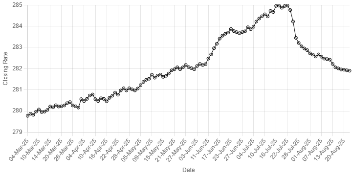On Thursday, the local unit closed the session at 281.92.