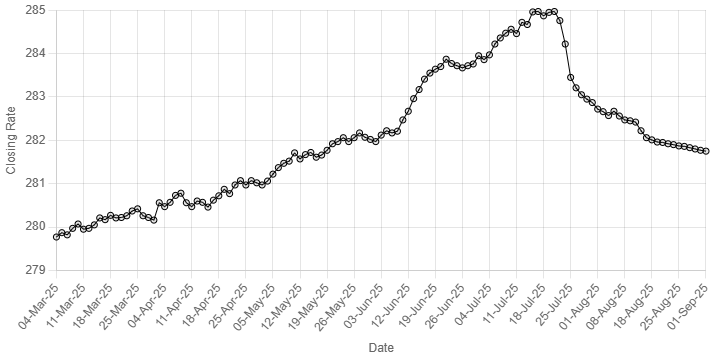 “25-Mar-25”, “26-Mar-25”, “27-Mar-25”, “28-Mar-25”, “03-Apr-25”, “04-Apr-25”, “07-Apr-25”, “08-Apr-25”, “09-Apr-25”, “10-Apr-25”, “11-Apr-25”, “14-Apr-25”, “15-Apr-25”, “16-Apr-25”, “17-Apr-25”, “18-Apr-25”, “21-Apr-25”, “22-Apr-25”, “23-Apr-25”, “24-Apr-25”, “25-Apr-25”, “28-Apr-25”, “29-Apr-25”, “30-Apr-25”, “02-May-25”, “05-May-25”, “06-May-25”, “07-May-25”, “08-May-25”, “09-May-25”, “12-May-25”, “13-May-25”, “14-May-25”, “15-May-25”, “16-May-25”, “19-May-25”, “20-May-25”, “21-May-25”, “22-May-25”, “23-May-25”, “26-May-25”, “27-May-25”, “29-May-25”, “30-May-25”, “02-Jun-25”, “03-Jun-25”, “04-Jun-25”, “05-Jun-25”, “10-Jun-25”, “11-Jun-25”, “12-Jun-25”, “13-Jun-25”, “16-Jun-25”, “17-Jun-25”, “18-Jun-25”, “19-Jun-25”, “20-Jun-25”, “23-Jun-25”, “24-Jun-25”, “25-Jun-25”, “26-Jun-25”, “27-Jun-25”, “30-Jun-25”, “02-Jul-25”, “03-Jul-25”, “04-Jul-25”, “07-Jul-25”, “08-Jul-25”, “09-Jul-25”, “10-Jul-25”, “11-Jul-25”, “14-Jul-25”, “15-Jul-25”, “16-Jul-25”, “17-Jul-25”, “18-Jul-25”, “21-Jul-25”, “22-Jul-25”, “23-Jul-25”, “24-Jul-25”, “25-Jul-25”, “28-Jul-25”, “29-Jul-25”, “30-Jul-25”, “31-Jul-25”, “01-Aug-25”, “04-Aug-25”, “05-Aug-25”, “06-Aug-25”, “07-Aug-25”, “08-Aug-25”, “11-Aug-25”, “12-Aug-25”, “13-Aug-25”, “15-Aug-25”, “18-Aug-25”, “19-Aug-25”, “20-Aug-25”, “21-Aug-25”, “22-Aug-25”, “25-Aug-25”, “26-Aug-25”, “27-Aug-25”, “28-Aug-25”, “29-Aug-25”, “01-Sep-25”
