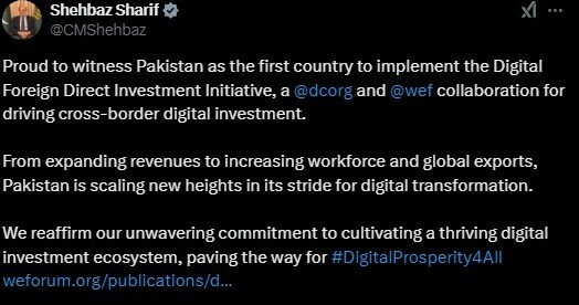 “Pakistan is the first country to adopt the Digital Foreign Direct Investment Initiative under the World Economic Forum,” said PM Shehbaz, in a statement issued by the Prime Minister’s Office (PMO).