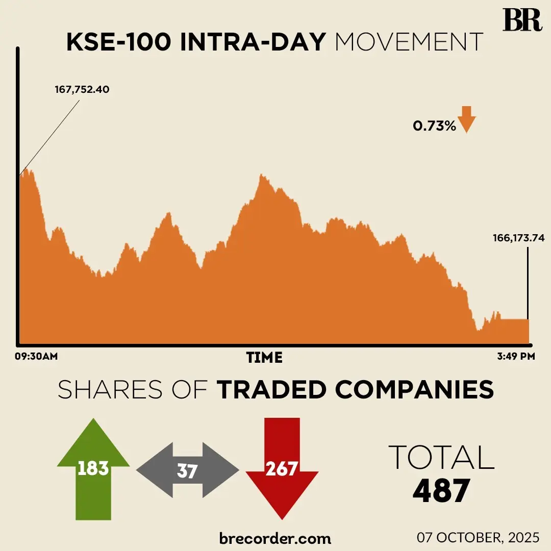 On Monday, the PSX closed on a broadly negative note as investor sentiment was pressured by escalating geopolitical tensions with India and heightened profit-taking. The benchmark KSE-100 Index ended at 167,752.41 points, losing 1,237.66 points, or 0.73%.