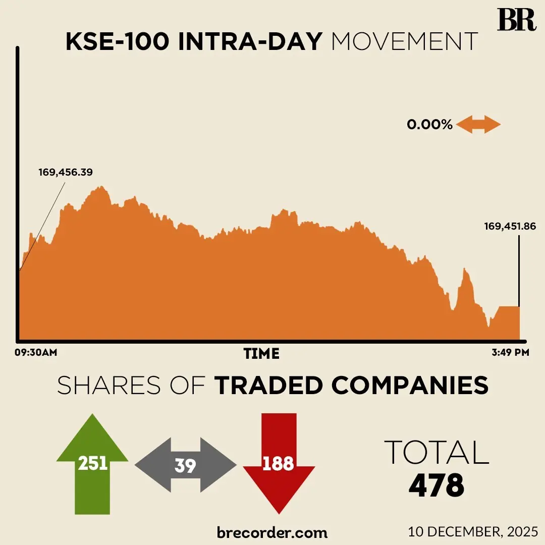 At close, the KSE-100 settled at 169,451.86, a marginal decrease of 4.52 points.