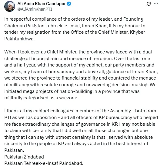 In a post on X following today’s surprise developments, Gandapur said: “In respectful compliance of the orders of my leader … Imran Khan, it is my honour to tender my resignation.”
