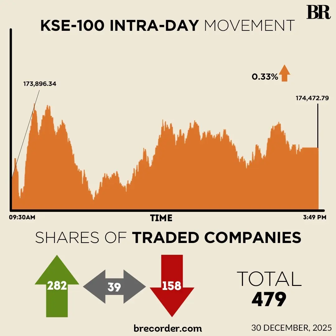 At close, the KSE-100 Index settled at 174,472.79, an increase of 576.45 points or 0.33%.
