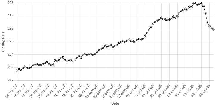 “25-Mar-25”, “26-Mar-25”, “27-Mar-25”, “28-Mar-25”, “03-Apr-25”, “04-Apr-25”, “07-Apr-25”, “08-Apr-25”, “09-Apr-25”, “10-Apr-25”, “11-Apr-25”, “14-Apr-25”, “15-Apr-25”, “16-Apr-25”, “17-Apr-25”, “18-Apr-25”, “21-Apr-25”, “22-Apr-25”, “23-Apr-25”, “24-Apr-25”, “25-Apr-25”, “28-Apr-25”, “29-Apr-25”, “30-Apr-25”, “02-May-25”, “05-May-25”, “06-May-25”, “07-May-25”, “08-May-25”, “09-May-25”, “12-May-25”, “13-May-25”, “14-May-25”, “15-May-25”, “16-May-25”, “19-May-25”, “20-May-25”, “21-May-25”, “22-May-25”, “23-May-25”, “26-May-25”, “27-May-25”, “29-May-25”, “30-May-25”, “02-Jun-25”, “03-Jun-25”, “04-Jun-25”, “05-Jun-25”, “10-Jun-25”, “11-Jun-25”, “12-Jun-25”, “13-Jun-25”, “16-Jun-25”, “17-Jun-25”, “18-Jun-25”, “19-Jun-25”, “20-Jun-25”, “23-Jun-25”, “24-Jun-25”, “25-Jun-25”, “26-Jun-25”, “27-Jun-25”, “30-Jun-25”, “02-Jul-25”, “03-Jul-25”, “04-Jul-25”, “07-Jul-25”, “08-Jul-25”, “09-Jul-25”, “10-Jul-25”, “11-Jul-25”, “14-Jul-25”, “15-Jul-25”, “16-Jul-25”, “17-Jul-25”, “18-Jul-25”, “21-Jul-25”, “22-Jul-25”, “23-Jul-25”, “24-Jul-25”, “25-Jul-25”, “28-Jul-25”, “29-Jul-25”, “30-Jul-25”