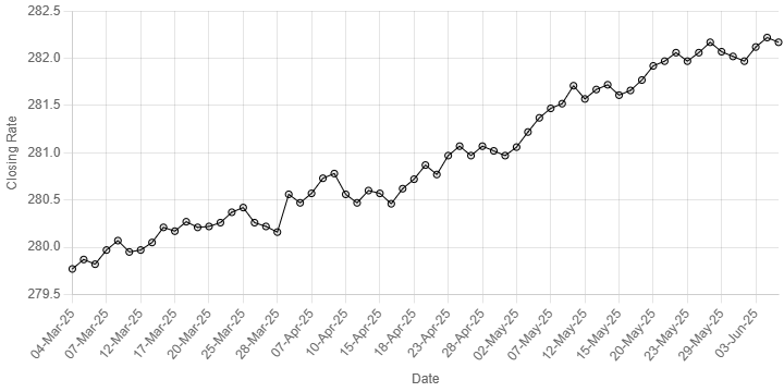 On Wednesday, the Pakistani rupee closed the day at 282.22.